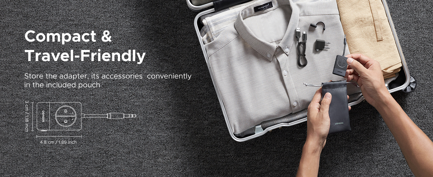 Ugreen 65706 BT305 được thiết kế với kích thước nhỏ, gọn gàng, dễ dàng mang theo trong mọi hành trình. Thiết bị được tích hợp đầu cắm đôi 3.5mm AUX, tương thích hoàn hảo với hệ thống giải trí trên máy bay, TV, máy tính bảng, laptop, hoặc máy chơi game.