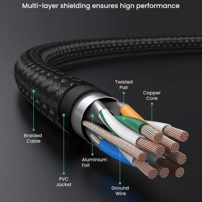 Một trong những điểm nổi bật của cáp mạng Ugreen Cat7 dài 2M 80423 NW150 là cấu trúc STP (Shielded Twisted Pair) – mỗi cặp dây đồng được bọc lớp chống nhiễu riêng, sau đó được bọc tổng thể bằng lớp lưới nhôm để triệt tiêu nhiễu điện từ (EMI) và nhiễu radio (RFI).