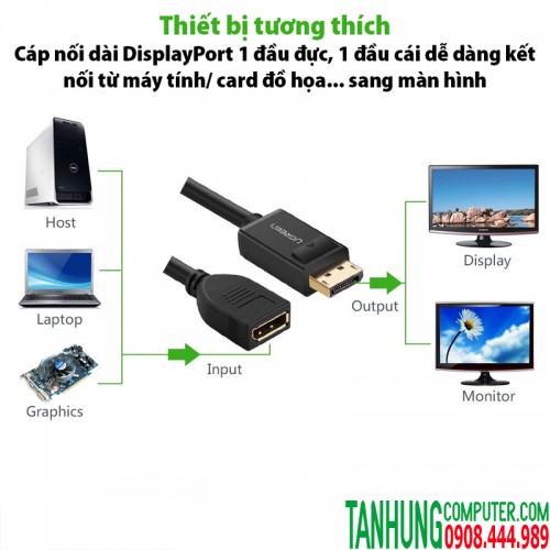 - Cáp nối dài DisplayPort Male to Female Ugreen 20407 dùng nối dài cáp DisplayPort để dễ dàng kết nối từ máy tính, Laptop, card màn hình có cổng Displayport như : Nvidia, AMD, intel.. tới màn hình