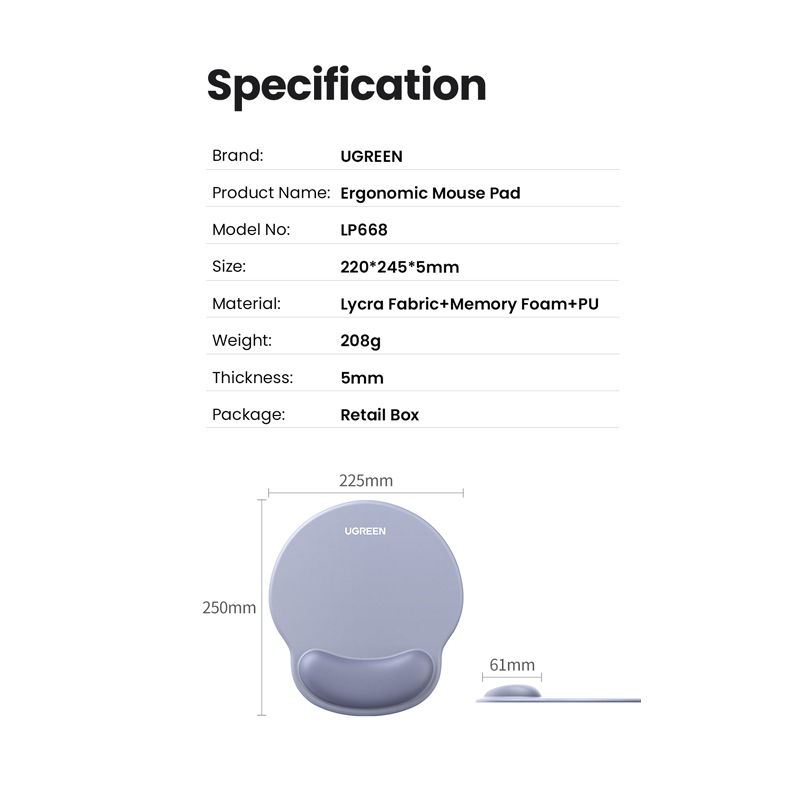 Sản phẩm là tấm lót chuột ergonomics có phần kê cổ tay Ugreen 25244 LP668, được thiết kế để hỗ trợ cổ tay, giảm mỏi và tăng sự thoải mái khi dùng chuột lâu dài. Mã sản phẩm gồm 25244 và tên thương mại thường ghi là LP668 – thuộc phụ kiện máy tính của UGREEN.
