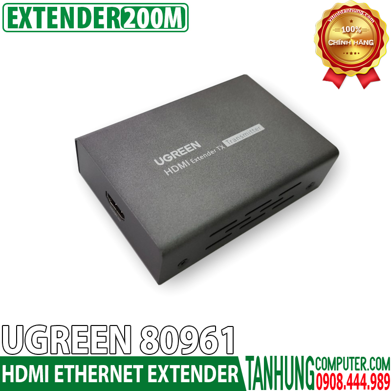 - Thiết bị kéo dài Ugreen 80961 là đầu phát (Transmitter) và kết hợp với Ugreen 80962 là đầu nhận (Receiver) để có thể sử dụng, với tín hiệu HDMI Input/Output hỗ trợ FullHD 1080P@60Hz nối ghép với nhau bằng đoạn cáp mạng cat5e/6 dài tối đa lên đến 200m. Giải pháp thay thế cáp HDMI bằng cáp mạng này giúp bạn hoàn toàn có thể yên tâm khi đi các hệ thống dây âm tường, đi dây cự ly xa, và giảm chi phí thi công, bảo trì…